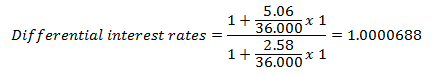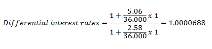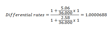 Arithmetical average of the CFD price multiplied by the above given rate differential1.30115*1.0000688= 1.301238