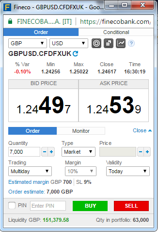Each quote includes FinecoBank's Bid-Offer spread for each trade which may be considered as the transaction cost which never exceeds 3 pips on the main exchange rates (e.g., GBP/USD).