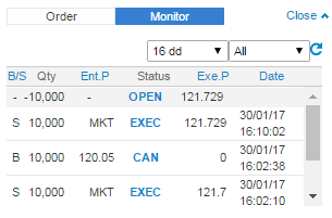 The order is executed, and my position consists of an order for GBP/USD 10,000. During the morning, I purchase GBP/USD 10,000 at the price of 1.28155 and I enter a trailing stop equal to 500 ticks (10 ticks = 1 pip) and purchase a further GBP/USD 20,000 at the price of 1.28055 and I place a stop loss equal to 1.27450 and take profit equal to 1.28975 on this order. The order is executed and my long position (consisting of three orders) is now GBP/USD 40,000. Each order has conditions that reside on Fineco’s servers. Once each condition occurs, a "market" order will be sent. If the GBP/USD instrument reaches the quote of 1.28555/1.28585 (take profit of the first order), Fineco will send a market order for GBP/USD 10,000, which is the amount of the first order. The overall position will, therefore, decrease to GBP/USD 30,000
