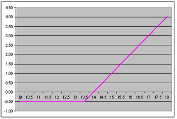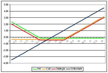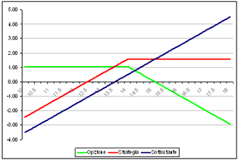 Let us assume that price of Y is €13.5, the market value of the CALL would amount to €0.75, while that of the PUT to about €0.46, for a total of €1.21.