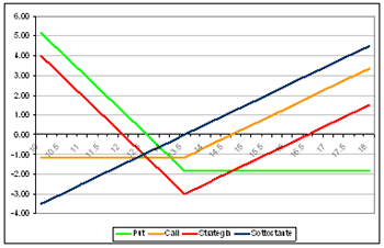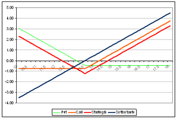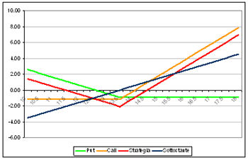 The cost of the CALL option is estimated at €1.15, while the put is €0.92, bringing the total strategy cost to €3. At expiration, the investor begins to earn money when prices are below €12 and above €16.5.