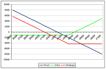 Investors struggling with a bearish position may wish to contain their losses through an appropriate hedging strategy. Let’s assume that the investor has opened a bearish position on the X index, positioned at 43000, selling the future, but intends to limit the possible losses by deciding ex ante the maximum down side by purchasing a CALL option with strike 45000.